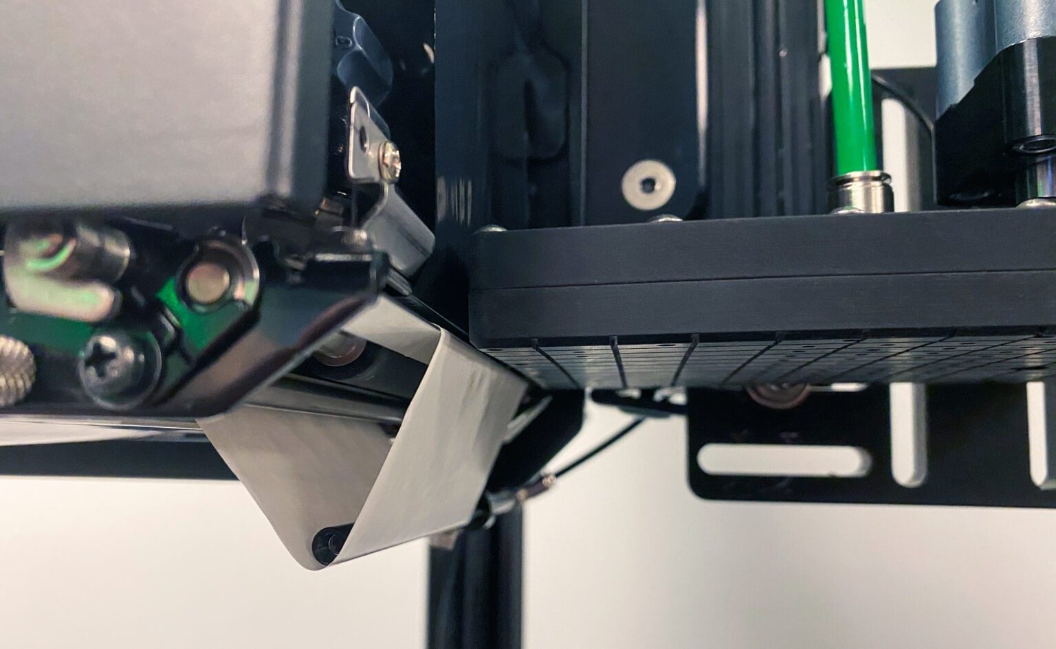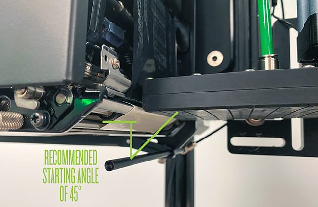 Typically, the holes of the air tube should be blowing onto the underside of the label at a 45º angle. Longer labels may require a slightly shallower angle. During setup, we start here and adjust until the label feeds out flat, centered, and without wrinkles or waves.