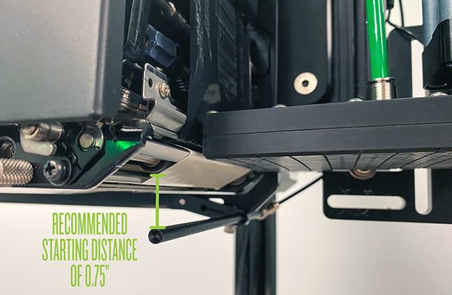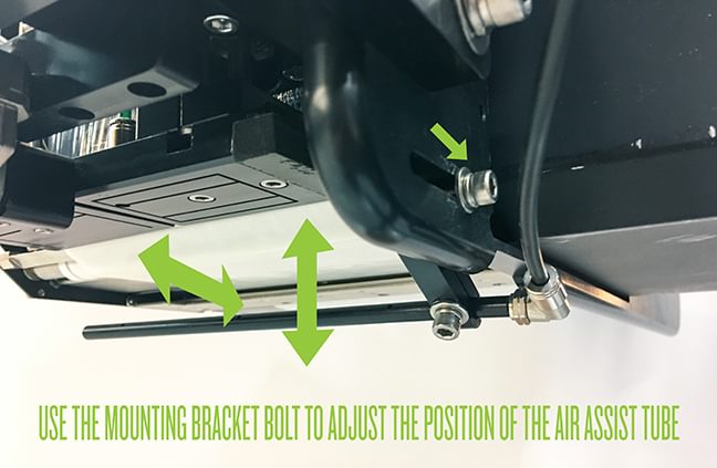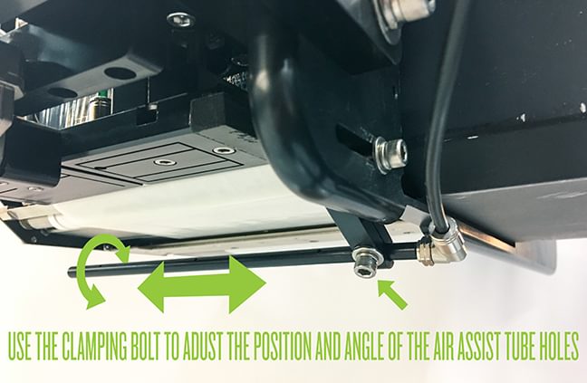 From this starting point, the distance can then be easily adjusted with the air assist bracket to get the air tube to the ideal position required for your application. To adjust the mounting bracket, loosen the bolt to affect the horizontal and vertical position of the air assist tube (shown below).